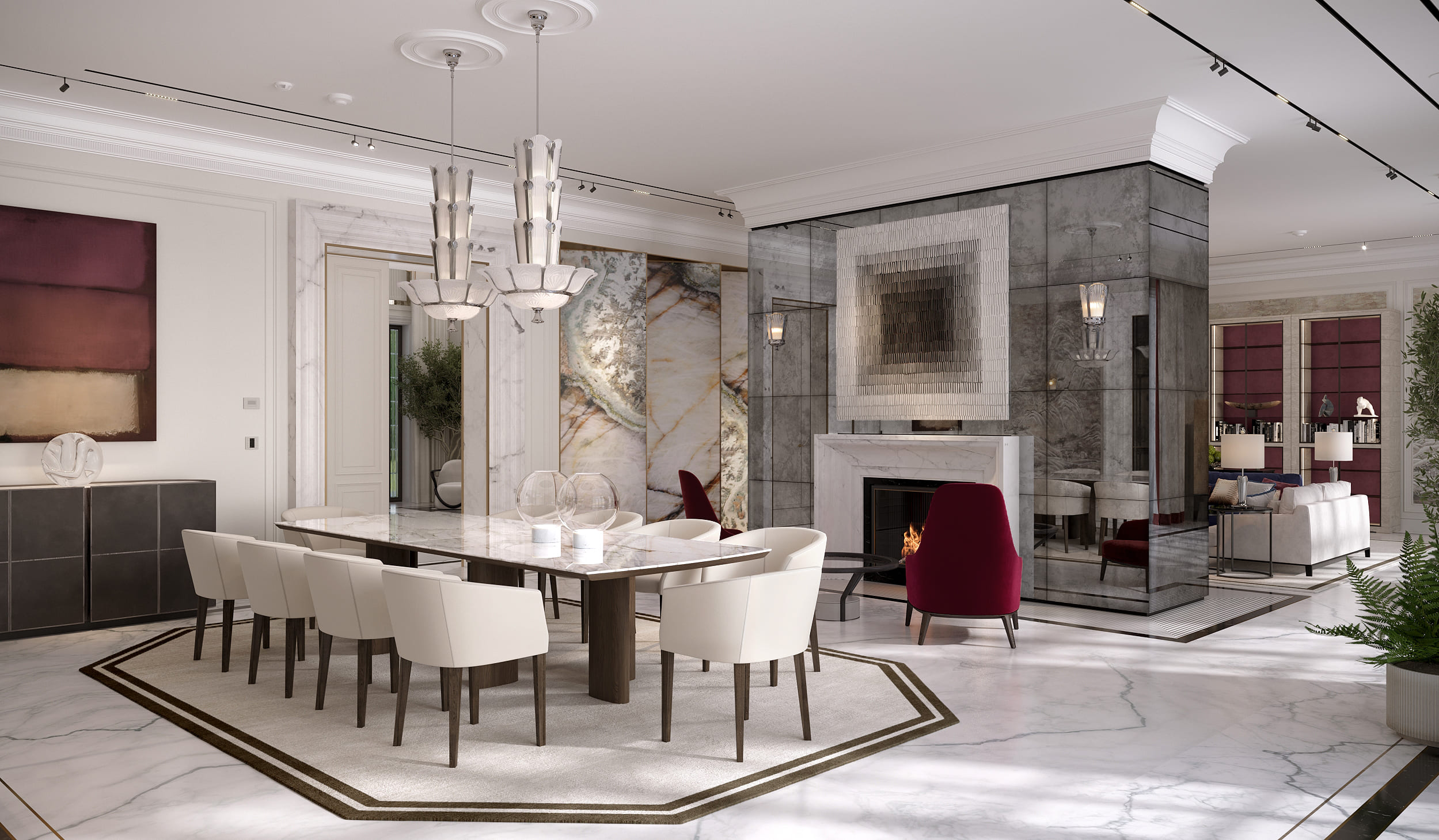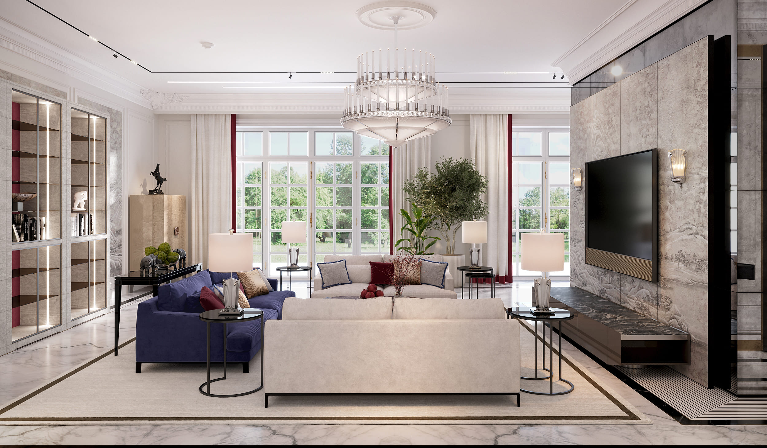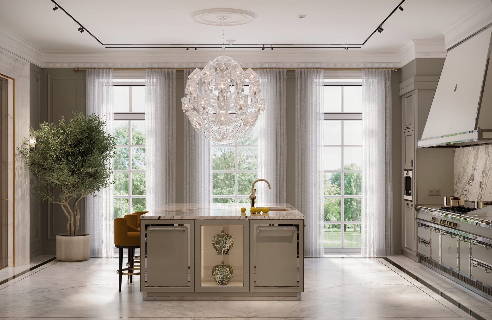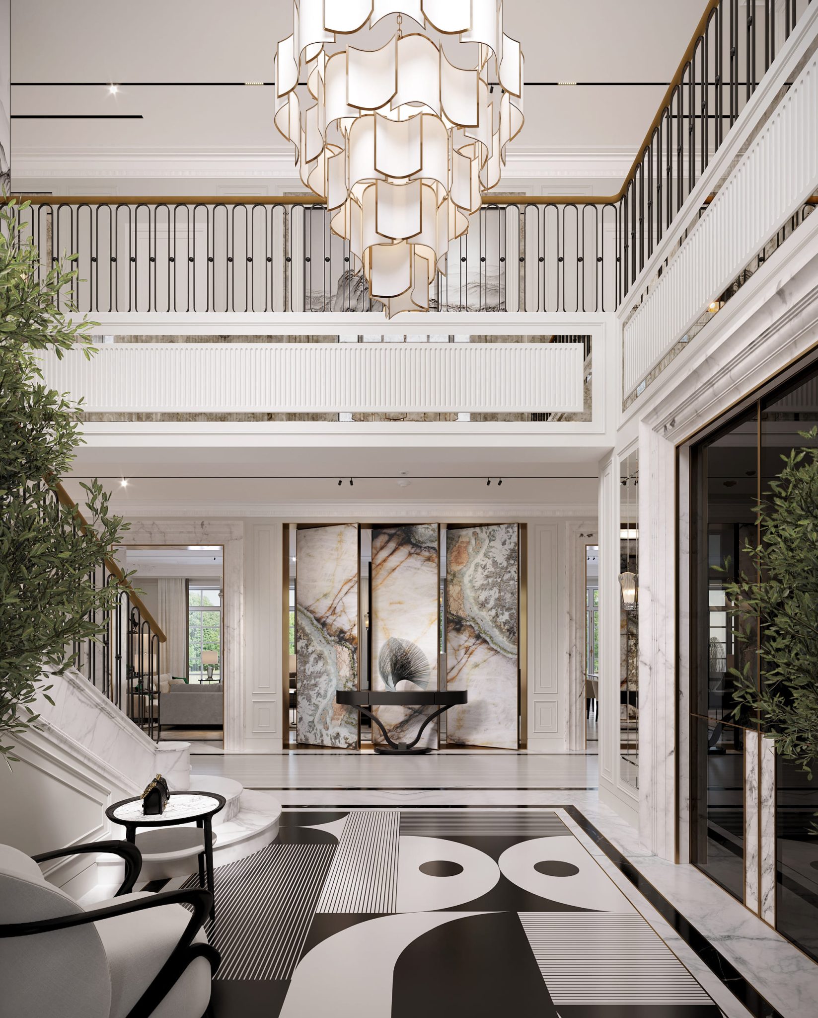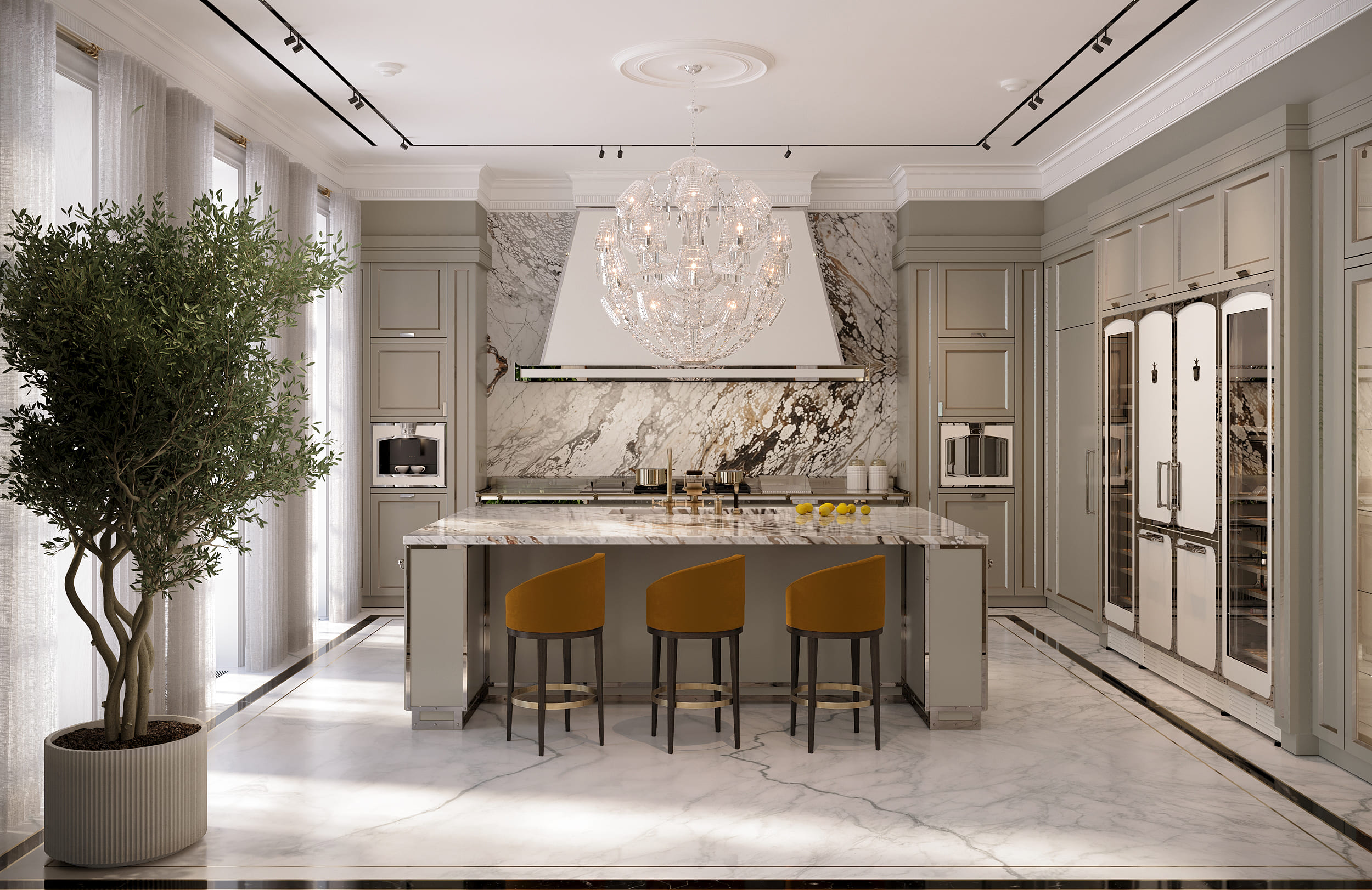 This residence, located in an exclusive and picturesque town, is designed in a contemporary classic style. The main house spans 2,400 m², complemented by a 1,700 m² spa complex and a 430 m² summer house. The interiors combine timeless classical detailing with modern premium materials and furnishings, offering both sophistication and long-term comfort.The corridors and entrance hall are designed in harmony with the overall style, featuring marble finishes. The flooring, with its black, white, and gray geometric motif, sets a graphic accent. An Officina Luce chandelier and De Gournay decorative panels highlight the elegance of the space.The generous living room integrates lounge and reception areas. Traditional ceiling moldings are paired with contemporary Flos lighting and a striking Lalique chandelier. Minotti furnishings add warmth and refinement, while expansive panoramic windows bathe the space in natural light.Walls are finished with bespoke wallpapers by the French atelier Décorné, each piece hand-painted by artisans preserving centuries-old techniques. For this project, shades and textures were custom-selected to achieve the required depth and effect. The palette is anchored in soft neutrals, enhanced with bold blue and burgundy accents. Across the interiors, only natural materials are used, including wood, marble, and onyx.The living area blends seamlessly with the dining room, both unified by the residence’s contemporary classic aesthetic. Decorative detailing, premium finishes, and Lalique chandeliers create a refined atmosphere, where every element complements the next in perfect balance.The custom-made Officine Gullo kitchen balances professional-grade functionality with exceptional aesthetics. The dining space maintains a restrained elegance, accented by statement chairs from Sofa & Chair London. At the center hangs a Baccarat crystal chandelier, adding a note of grandeur.A space where prestige meets refinement, the study offers the perfect environment for work and reflection. Poltrona Frau sofas provide comfort, complemented by a Moooi rug, Oficina Luce lighting, and furnishings by Giorgetti and Opera.Dedicated to wellness and relaxation, the spa combines natural materials, carefully designed lighting, and tactile textures to create a calm, restorative environment. Green accent details and a vertical plant wall reinforce the connection with nature.This project embodies the Bolshakova Studio philosophy: a comprehensive approach to space, meticulous attention to detail, and the curation of world-leading brands. The result is a residence in a contemporary classic style that guarantees timeless aesthetics, comfort, and enduring quality.