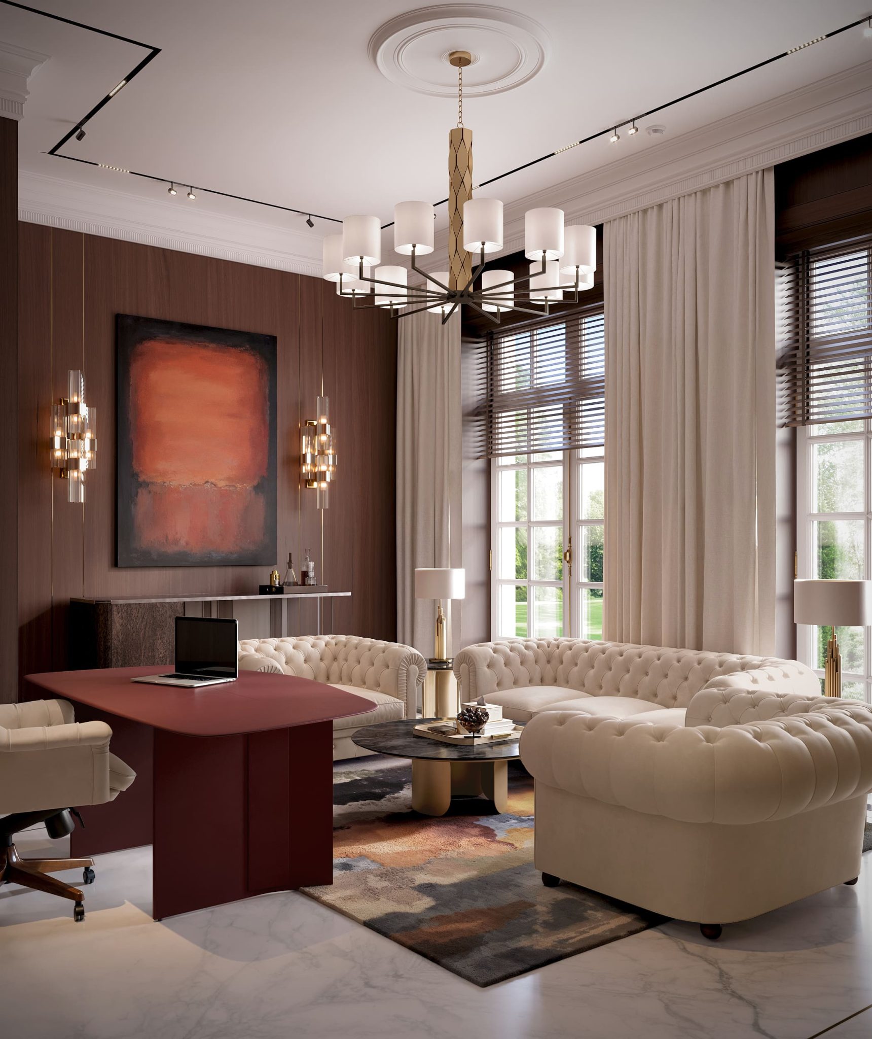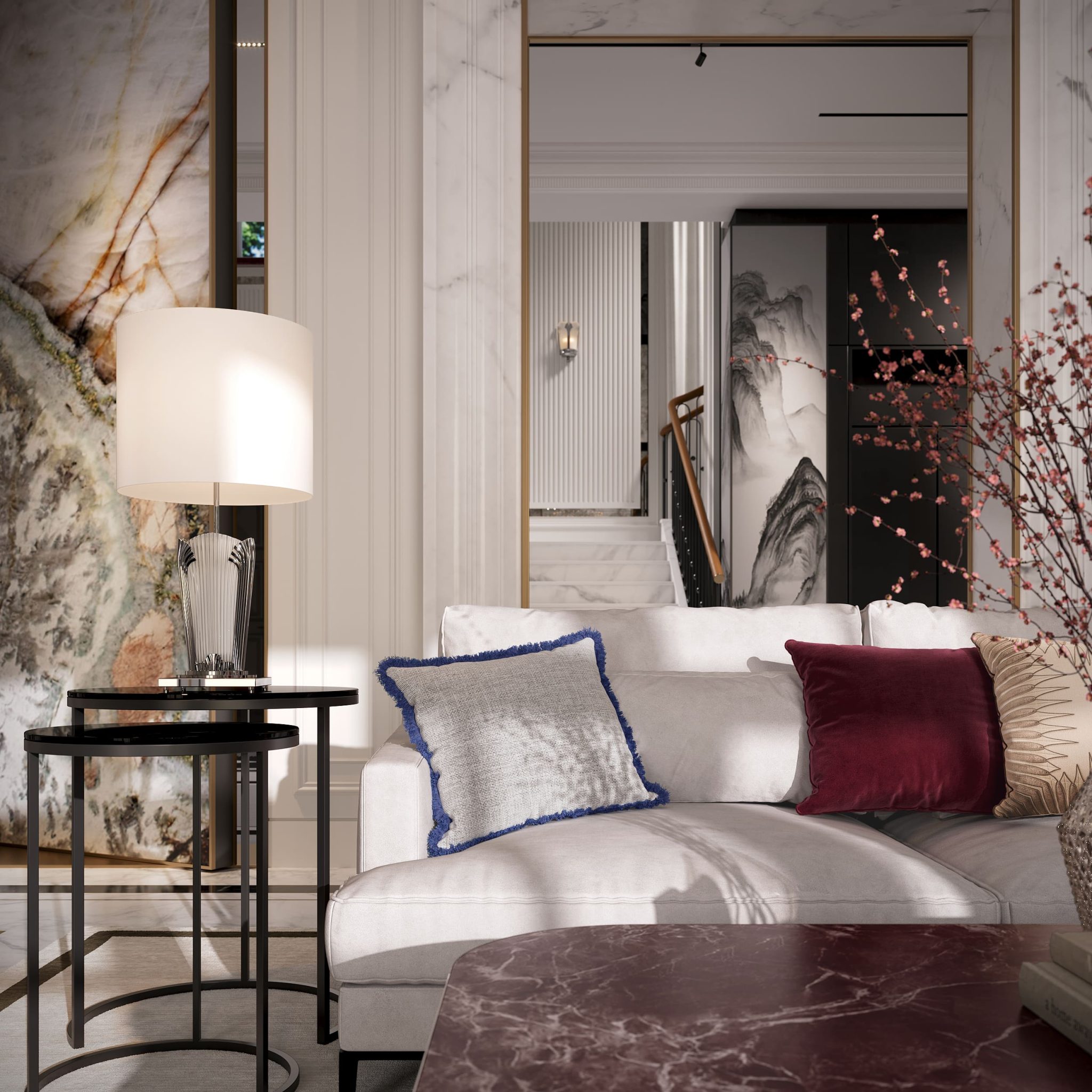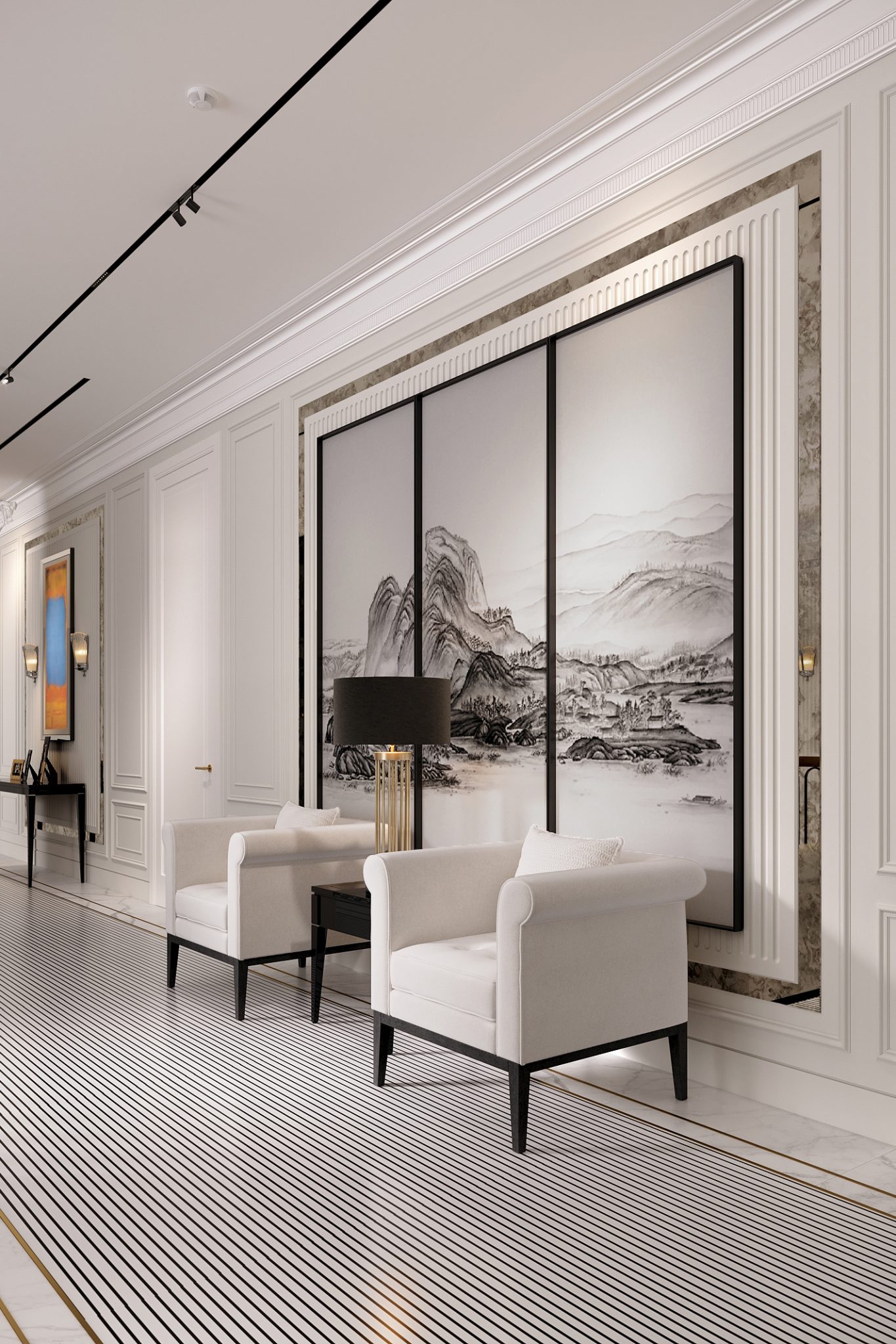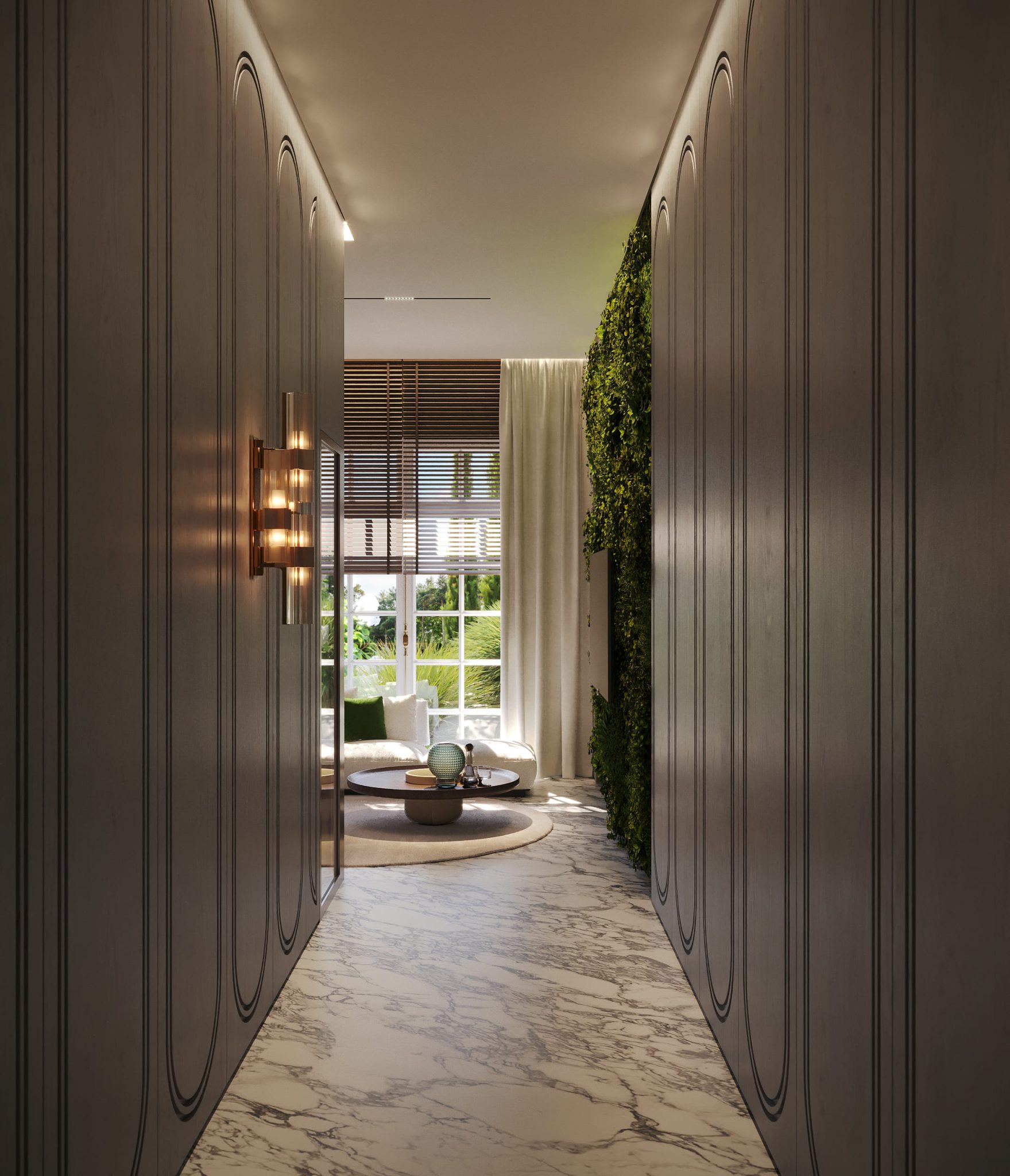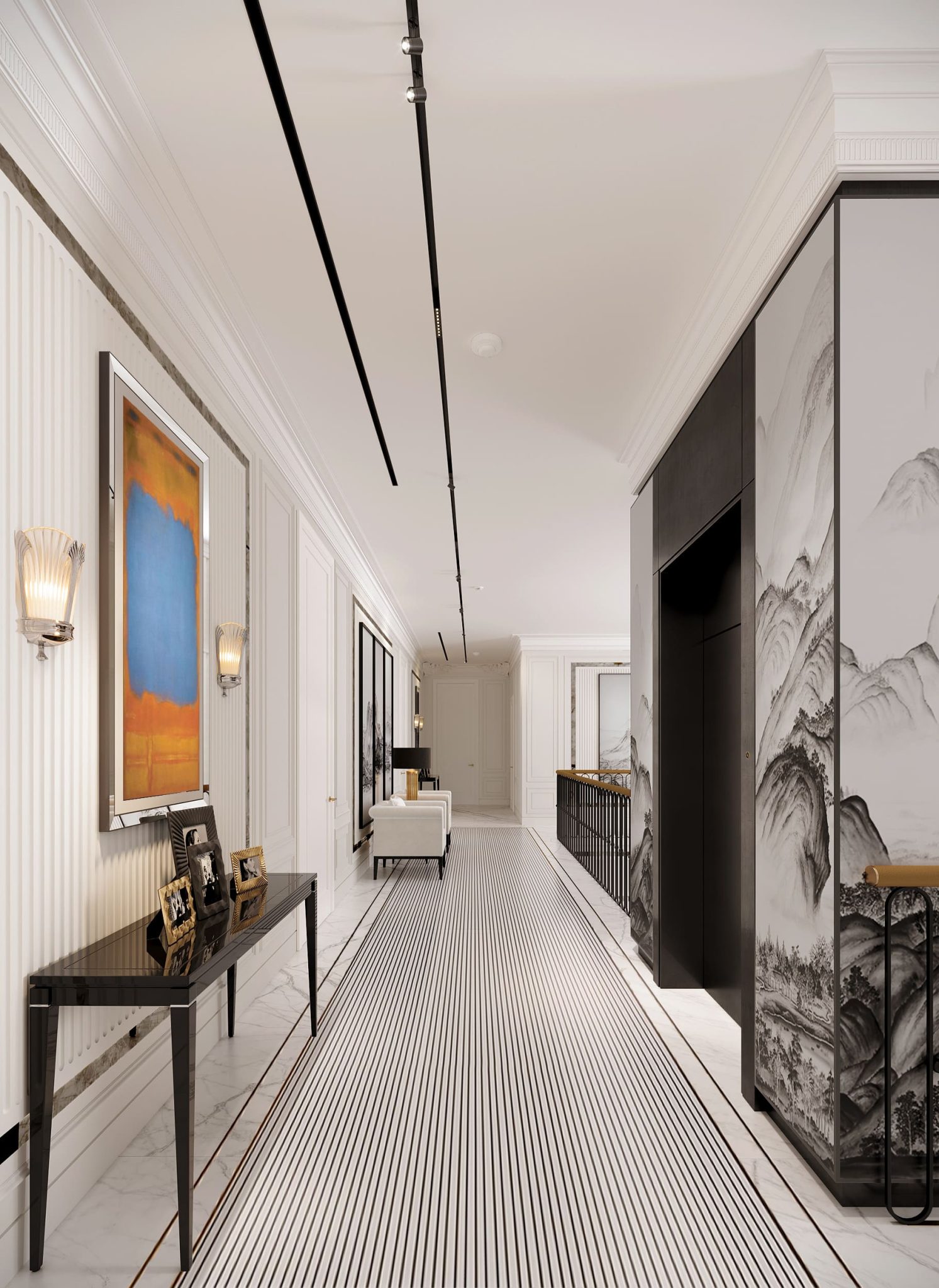 This residence, located in an exclusive and picturesque town, is designed in a contemporary classic style. The main house spans 2,400 m², complemented by a 1,700 m² spa complex and a 430 m² summer house. The interiors combine timeless classical detailing with modern premium materials and furnishings, offering both sophistication and long-term comfort.The corridors and entrance hall are designed in harmony with the overall style, featuring marble finishes. The flooring, with its black, white, and gray geometric motif, sets a graphic accent. An Officina Luce chandelier and De Gournay decorative panels highlight the elegance of the space.The generous living room integrates lounge and reception areas. Traditional ceiling moldings are paired with contemporary Flos lighting and a striking Lalique chandelier. Minotti furnishings add warmth and refinement, while expansive panoramic windows bathe the space in natural light.Walls are finished with bespoke wallpapers by the French atelier Décorné, each piece hand-painted by artisans preserving centuries-old techniques. For this project, shades and textures were custom-selected to achieve the required depth and effect. The palette is anchored in soft neutrals, enhanced with bold blue and burgundy accents. Across the interiors, only natural materials are used, including wood, marble, and onyx.The living area blends seamlessly with the dining room, both unified by the residence’s contemporary classic aesthetic. Decorative detailing, premium finishes, and Lalique chandeliers create a refined atmosphere, where every element complements the next in perfect balance.The custom-made Officine Gullo kitchen balances professional-grade functionality with exceptional aesthetics. The dining space maintains a restrained elegance, accented by statement chairs from Sofa & Chair London. At the center hangs a Baccarat crystal chandelier, adding a note of grandeur.A space where prestige meets refinement, the study offers the perfect environment for work and reflection. Poltrona Frau sofas provide comfort, complemented by a Moooi rug, Oficina Luce lighting, and furnishings by Giorgetti and Opera.Dedicated to wellness and relaxation, the spa combines natural materials, carefully designed lighting, and tactile textures to create a calm, restorative environment. Green accent details and a vertical plant wall reinforce the connection with nature.This project embodies the Bolshakova Studio philosophy: a comprehensive approach to space, meticulous attention to detail, and the curation of world-leading brands. The result is a residence in a contemporary classic style that guarantees timeless aesthetics, comfort, and enduring quality.