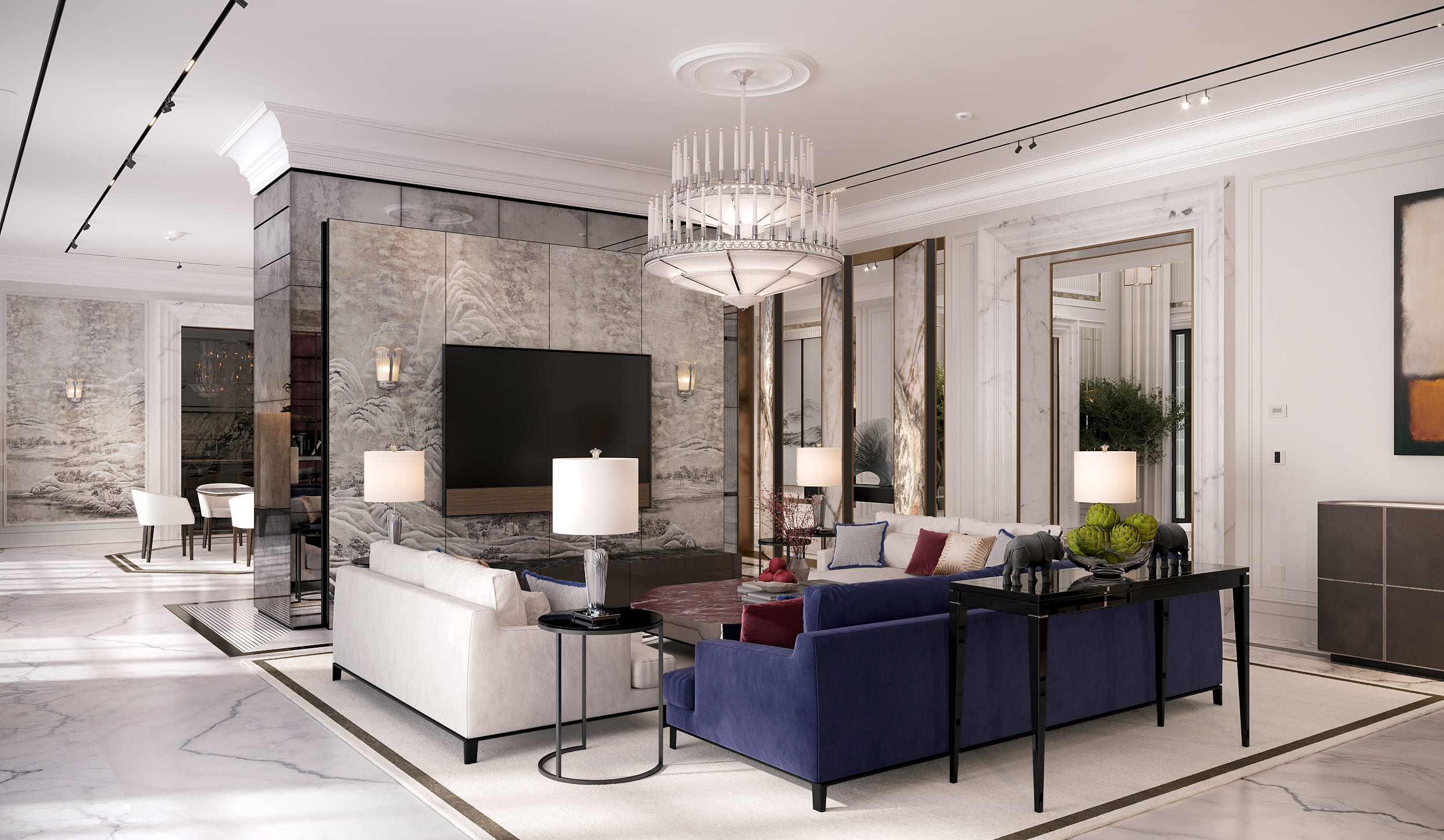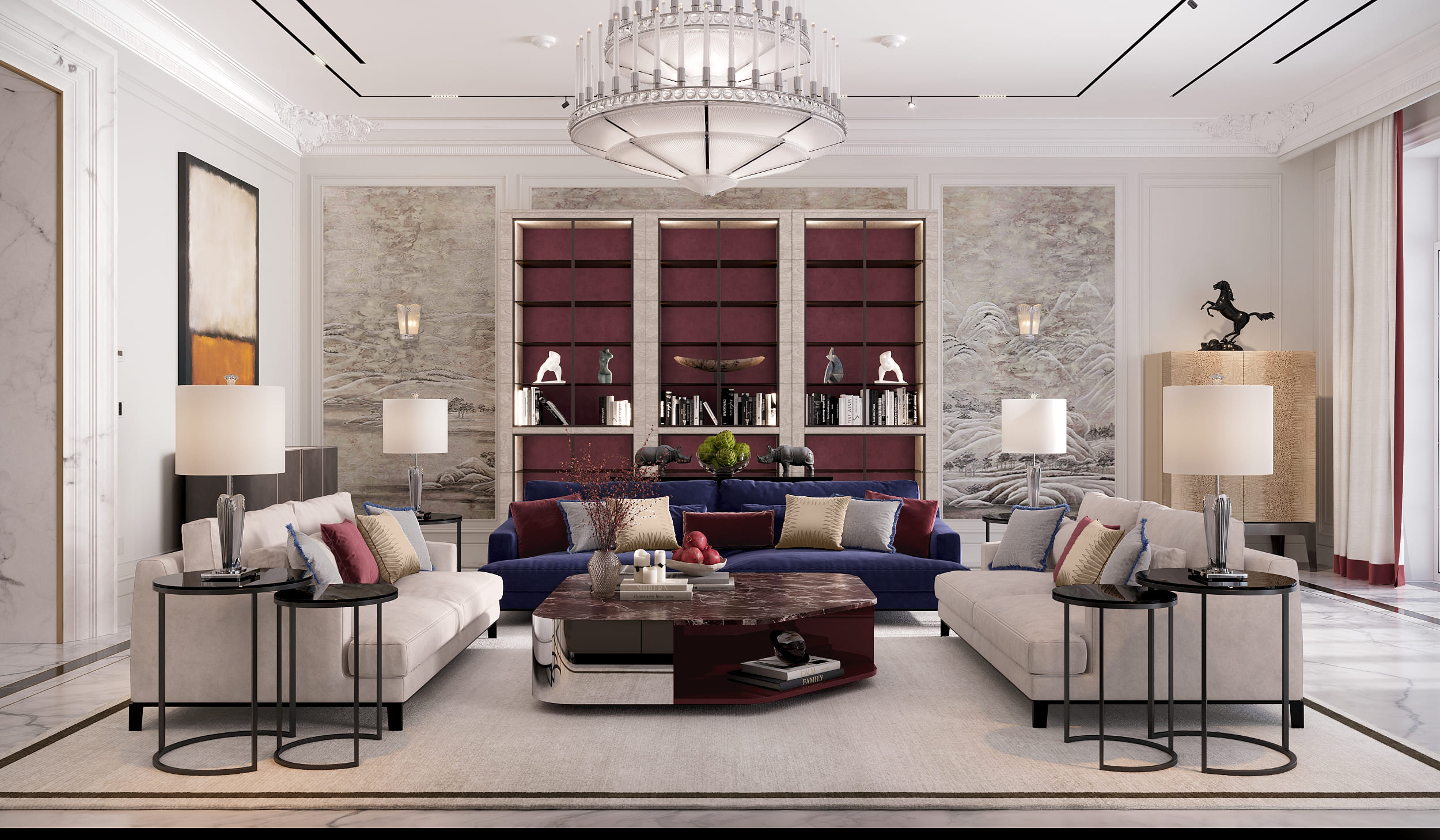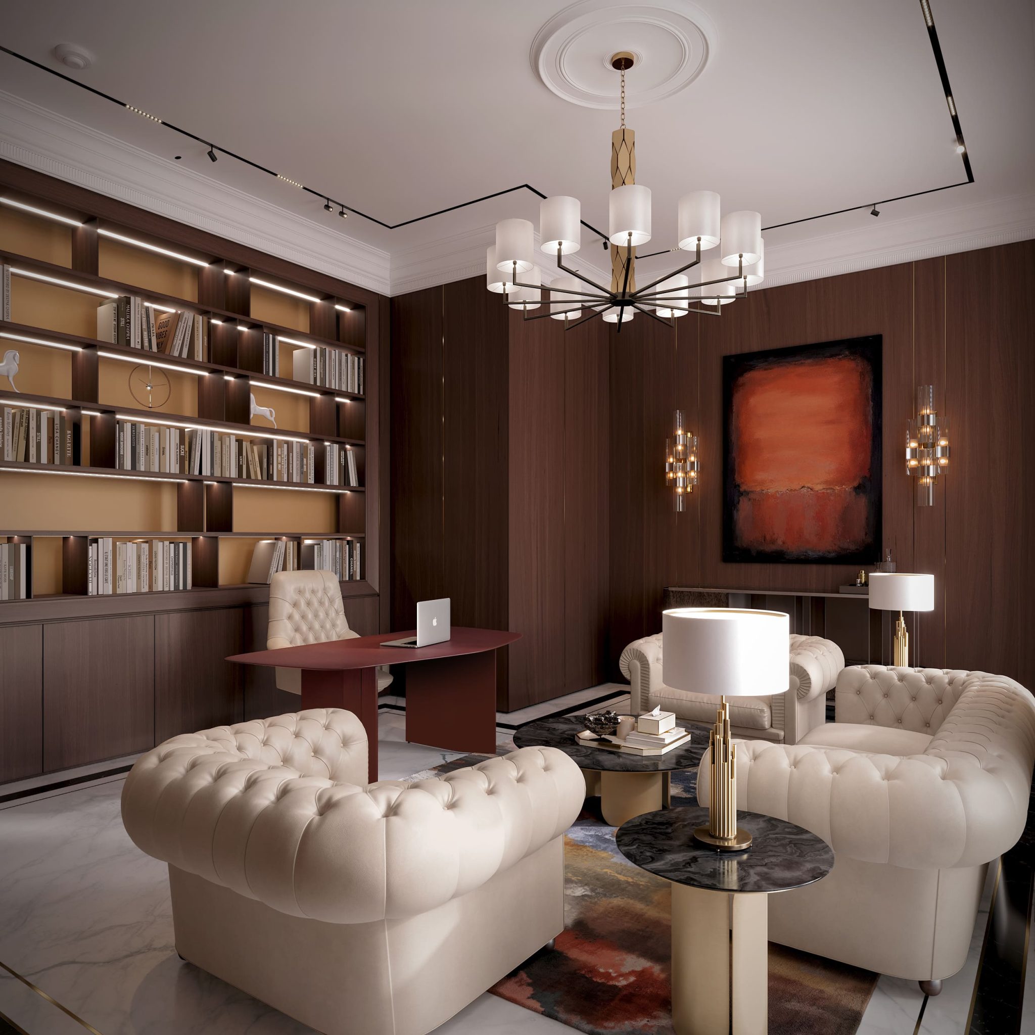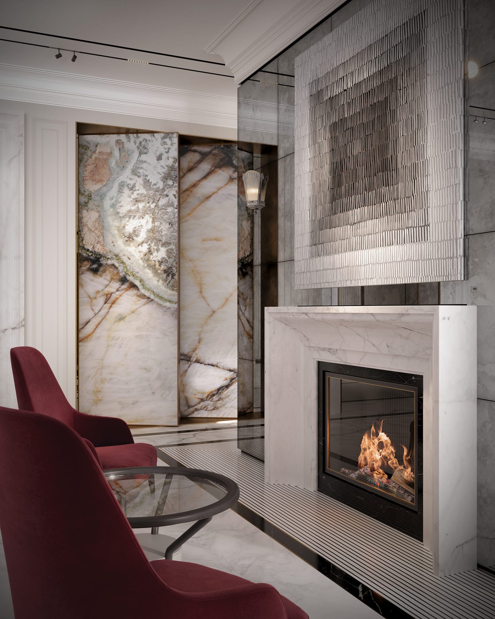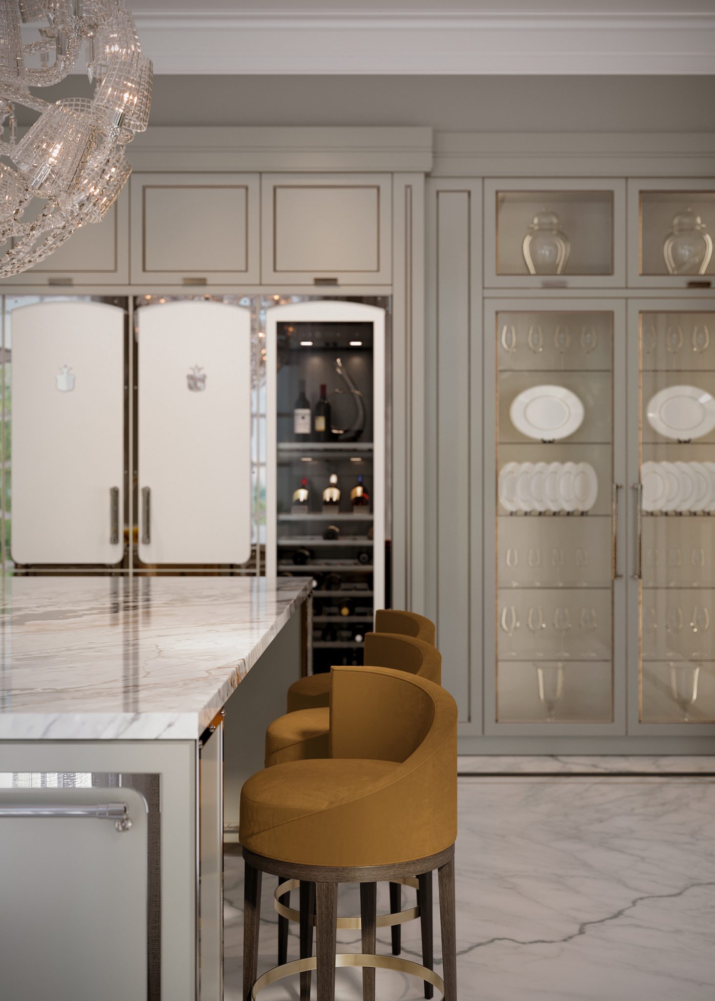 This residence, located in an exclusive and picturesque town, is designed in a contemporary classic style. The main house spans 2,400 m², complemented by a 1,700 m² spa complex and a 430 m² summer house. The interiors combine timeless classical detailing with modern premium materials and furnishings, offering both sophistication and long-term comfort.The corridors and entrance hall are designed in harmony with the overall style, featuring marble finishes. The flooring, with its black, white, and gray geometric motif, sets a graphic accent. An Officina Luce chandelier and De Gournay decorative panels highlight the elegance of the space.The generous living room integrates lounge and reception areas. Traditional ceiling moldings are paired with contemporary Flos lighting and a striking Lalique chandelier. Minotti furnishings add warmth and refinement, while expansive panoramic windows bathe the space in natural light.Walls are finished with bespoke wallpapers by the French atelier Décorné, each piece hand-painted by artisans preserving centuries-old techniques. For this project, shades and textures were custom-selected to achieve the required depth and effect. The palette is anchored in soft neutrals, enhanced with bold blue and burgundy accents. Across the interiors, only natural materials are used, including wood, marble, and onyx.The living area blends seamlessly with the dining room, both unified by the residence’s contemporary classic aesthetic. Decorative detailing, premium finishes, and Lalique chandeliers create a refined atmosphere, where every element complements the next in perfect balance.The custom-made Officine Gullo kitchen balances professional-grade functionality with exceptional aesthetics. The dining space maintains a restrained elegance, accented by statement chairs from Sofa & Chair London. At the center hangs a Baccarat crystal chandelier, adding a note of grandeur.A space where prestige meets refinement, the study offers the perfect environment for work and reflection. Poltrona Frau sofas provide comfort, complemented by a Moooi rug, Oficina Luce lighting, and furnishings by Giorgetti and Opera.Dedicated to wellness and relaxation, the spa combines natural materials, carefully designed lighting, and tactile textures to create a calm, restorative environment. Green accent details and a vertical plant wall reinforce the connection with nature.This project embodies the Bolshakova Studio philosophy: a comprehensive approach to space, meticulous attention to detail, and the curation of world-leading brands. The result is a residence in a contemporary classic style that guarantees timeless aesthetics, comfort, and enduring quality.