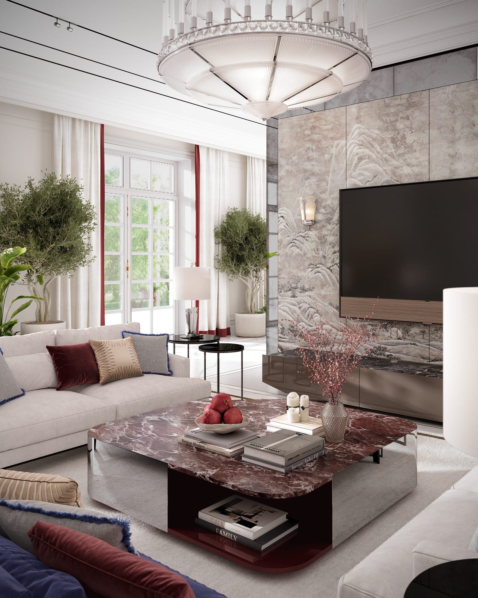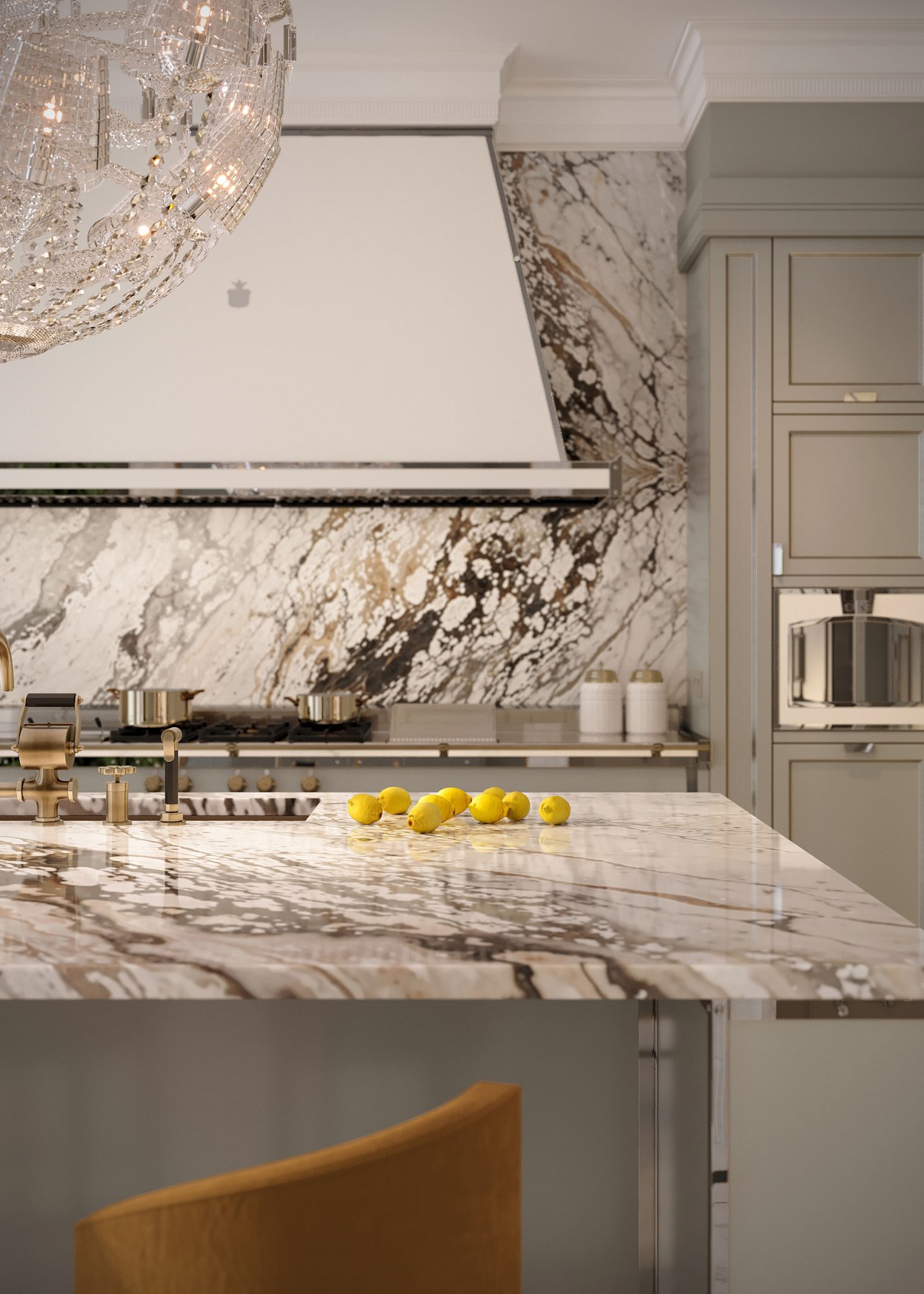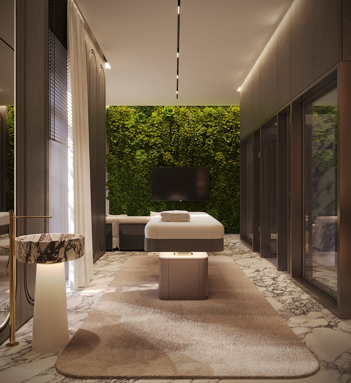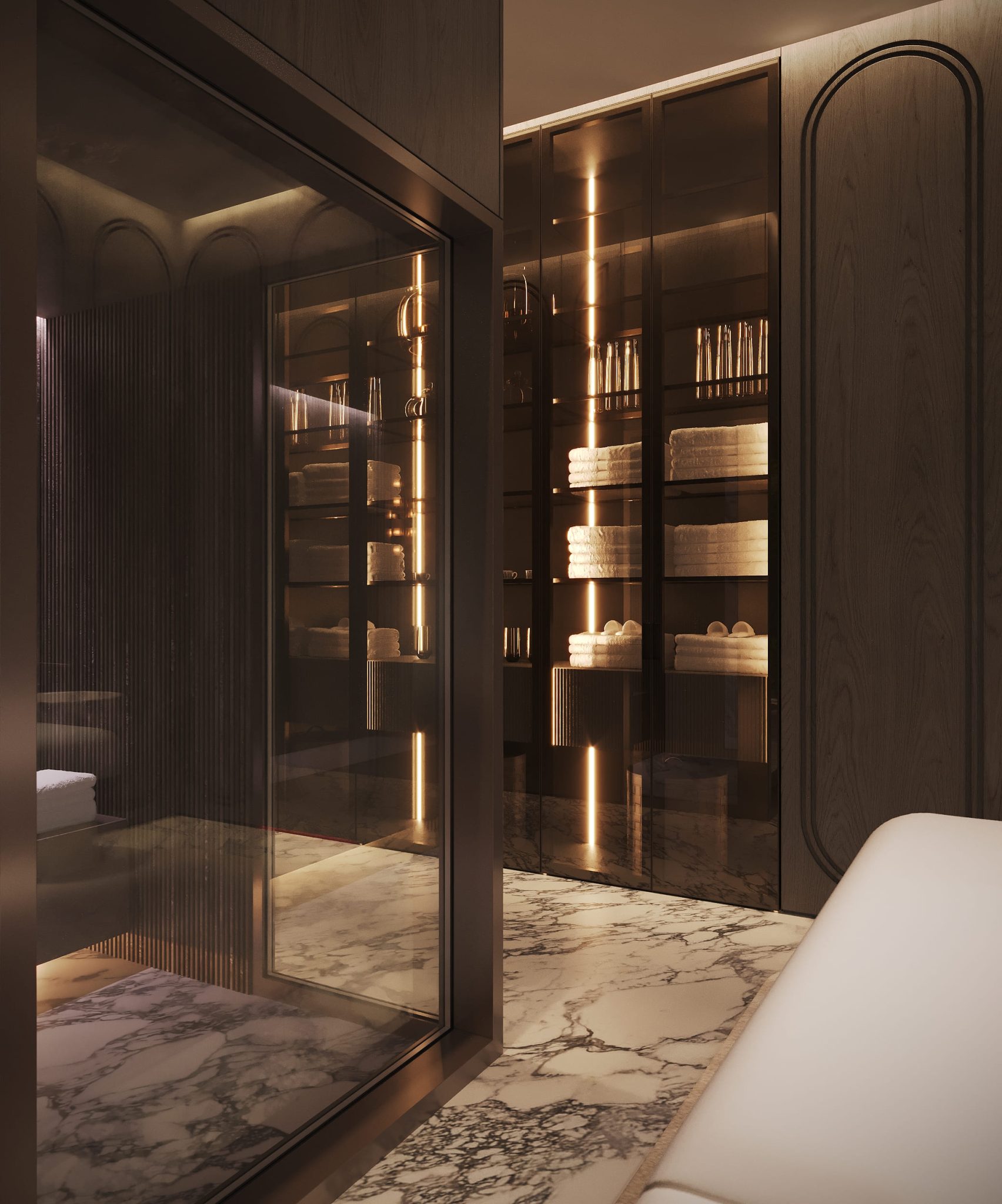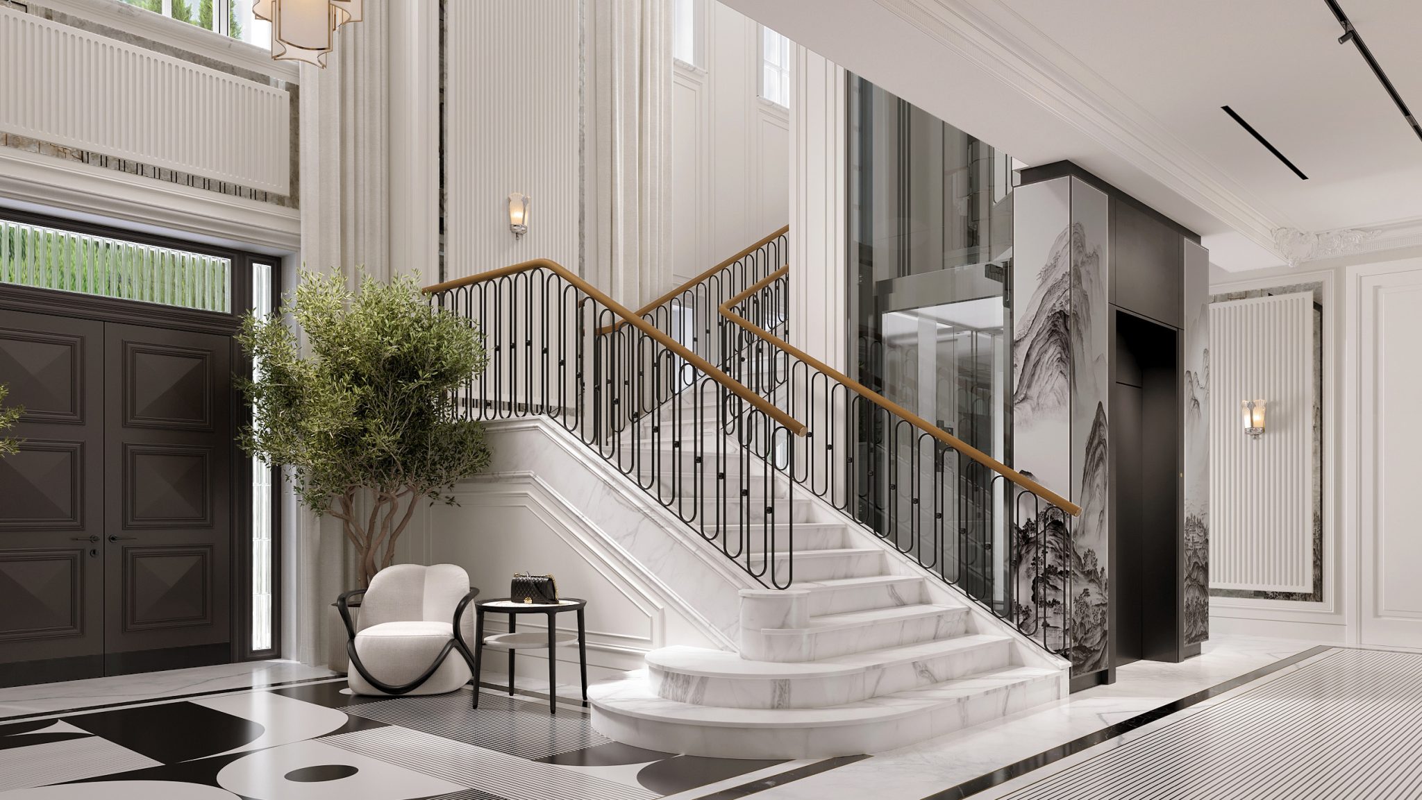 This residence, located in an exclusive and picturesque town, is designed in a contemporary classic style. The main house spans 2,400 m², complemented by a 1,700 m² spa complex and a 430 m² summer house. The interiors combine timeless classical detailing with modern premium materials and furnishings, offering both sophistication and long-term comfort.The corridors and entrance hall are designed in harmony with the overall style, featuring marble finishes. The flooring, with its black, white, and gray geometric motif, sets a graphic accent. An Officina Luce chandelier and De Gournay decorative panels highlight the elegance of the space.The generous living room integrates lounge and reception areas. Traditional ceiling moldings are paired with contemporary Flos lighting and a striking Lalique chandelier. Minotti furnishings add warmth and refinement, while expansive panoramic windows bathe the space in natural light.Walls are finished with bespoke wallpapers by the French atelier Décorné, each piece hand-painted by artisans preserving centuries-old techniques. For this project, shades and textures were custom-selected to achieve the required depth and effect. The palette is anchored in soft neutrals, enhanced with bold blue and burgundy accents. Across the interiors, only natural materials are used, including wood, marble, and onyx.The living area blends seamlessly with the dining room, both unified by the residence’s contemporary classic aesthetic. Decorative detailing, premium finishes, and Lalique chandeliers create a refined atmosphere, where every element complements the next in perfect balance.The custom-made Officine Gullo kitchen balances professional-grade functionality with exceptional aesthetics. The dining space maintains a restrained elegance, accented by statement chairs from Sofa & Chair London. At the center hangs a Baccarat crystal chandelier, adding a note of grandeur.A space where prestige meets refinement, the study offers the perfect environment for work and reflection. Poltrona Frau sofas provide comfort, complemented by a Moooi rug, Oficina Luce lighting, and furnishings by Giorgetti and Opera.Dedicated to wellness and relaxation, the spa combines natural materials, carefully designed lighting, and tactile textures to create a calm, restorative environment. Green accent details and a vertical plant wall reinforce the connection with nature.This project embodies the Bolshakova Studio philosophy: a comprehensive approach to space, meticulous attention to detail, and the curation of world-leading brands. The result is a residence in a contemporary classic style that guarantees timeless aesthetics, comfort, and enduring quality.