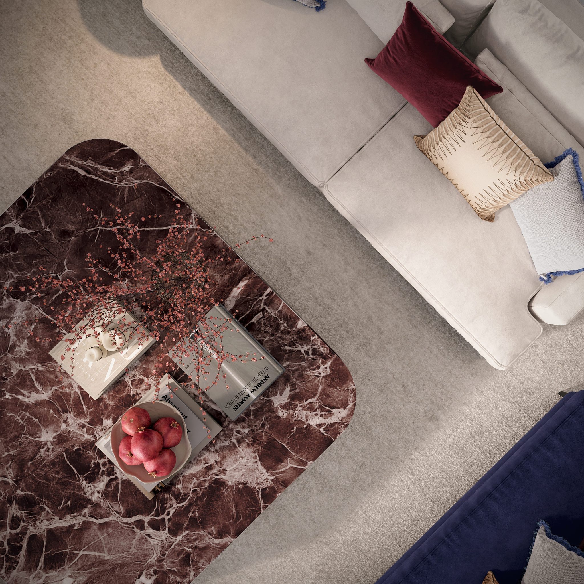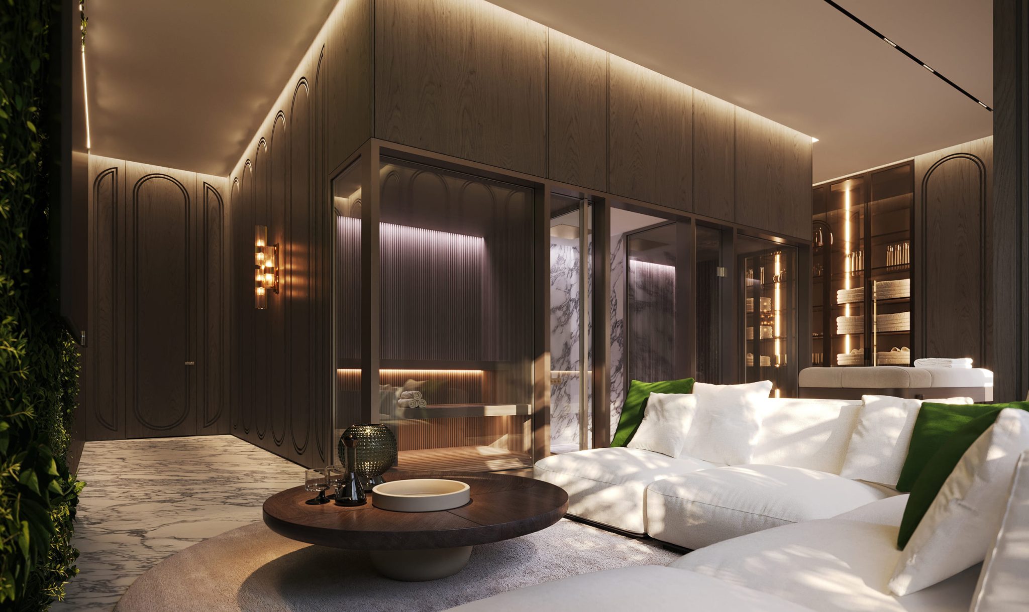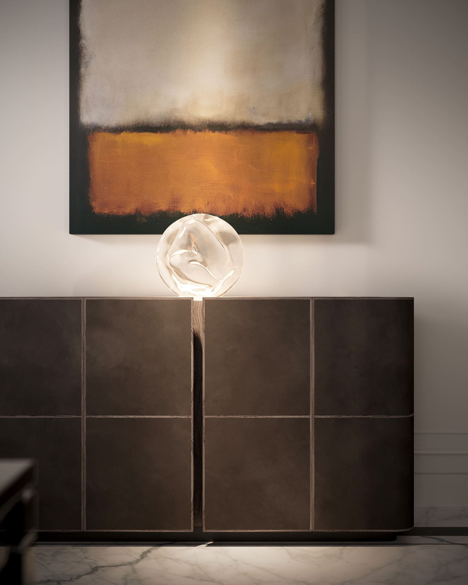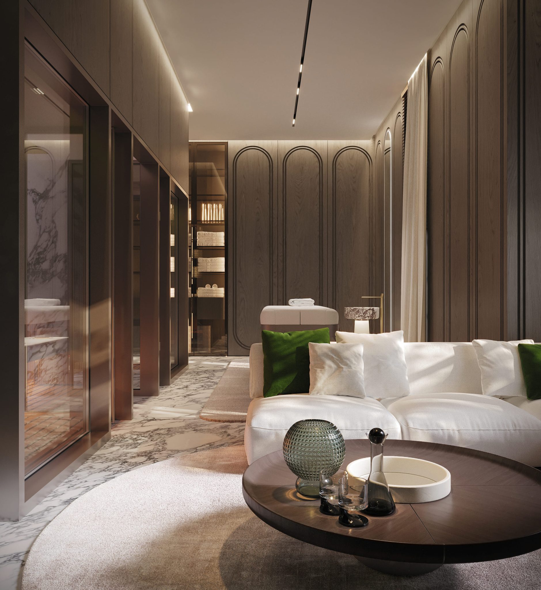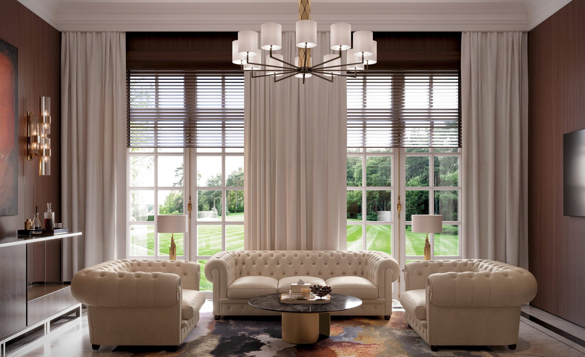 This residence, located in an exclusive and picturesque town, is designed in a contemporary classic style. The main house spans 2,400 m², complemented by a 1,700 m² spa complex and a 430 m² summer house. The interiors combine timeless classical detailing with modern premium materials and furnishings, offering both sophistication and long-term comfort.The corridors and entrance hall are designed in harmony with the overall style, featuring marble finishes. The flooring, with its black, white, and gray geometric motif, sets a graphic accent. An Officina Luce chandelier and De Gournay decorative panels highlight the elegance of the space.The generous living room integrates lounge and reception areas. Traditional ceiling moldings are paired with contemporary Flos lighting and a striking Lalique chandelier. Minotti furnishings add warmth and refinement, while expansive panoramic windows bathe the space in natural light.Walls are finished with bespoke wallpapers by the French atelier Décorné, each piece hand-painted by artisans preserving centuries-old techniques. For this project, shades and textures were custom-selected to achieve the required depth and effect. The palette is anchored in soft neutrals, enhanced with bold blue and burgundy accents. Across the interiors, only natural materials are used, including wood, marble, and onyx.The living area blends seamlessly with the dining room, both unified by the residence’s contemporary classic aesthetic. Decorative detailing, premium finishes, and Lalique chandeliers create a refined atmosphere, where every element complements the next in perfect balance.The custom-made Officine Gullo kitchen balances professional-grade functionality with exceptional aesthetics. The dining space maintains a restrained elegance, accented by statement chairs from Sofa & Chair London. At the center hangs a Baccarat crystal chandelier, adding a note of grandeur.A space where prestige meets refinement, the study offers the perfect environment for work and reflection. Poltrona Frau sofas provide comfort, complemented by a Moooi rug, Oficina Luce lighting, and furnishings by Giorgetti and Opera.Dedicated to wellness and relaxation, the spa combines natural materials, carefully designed lighting, and tactile textures to create a calm, restorative environment. Green accent details and a vertical plant wall reinforce the connection with nature.This project embodies the Bolshakova Studio philosophy: a comprehensive approach to space, meticulous attention to detail, and the curation of world-leading brands. The result is a residence in a contemporary classic style that guarantees timeless aesthetics, comfort, and enduring quality.