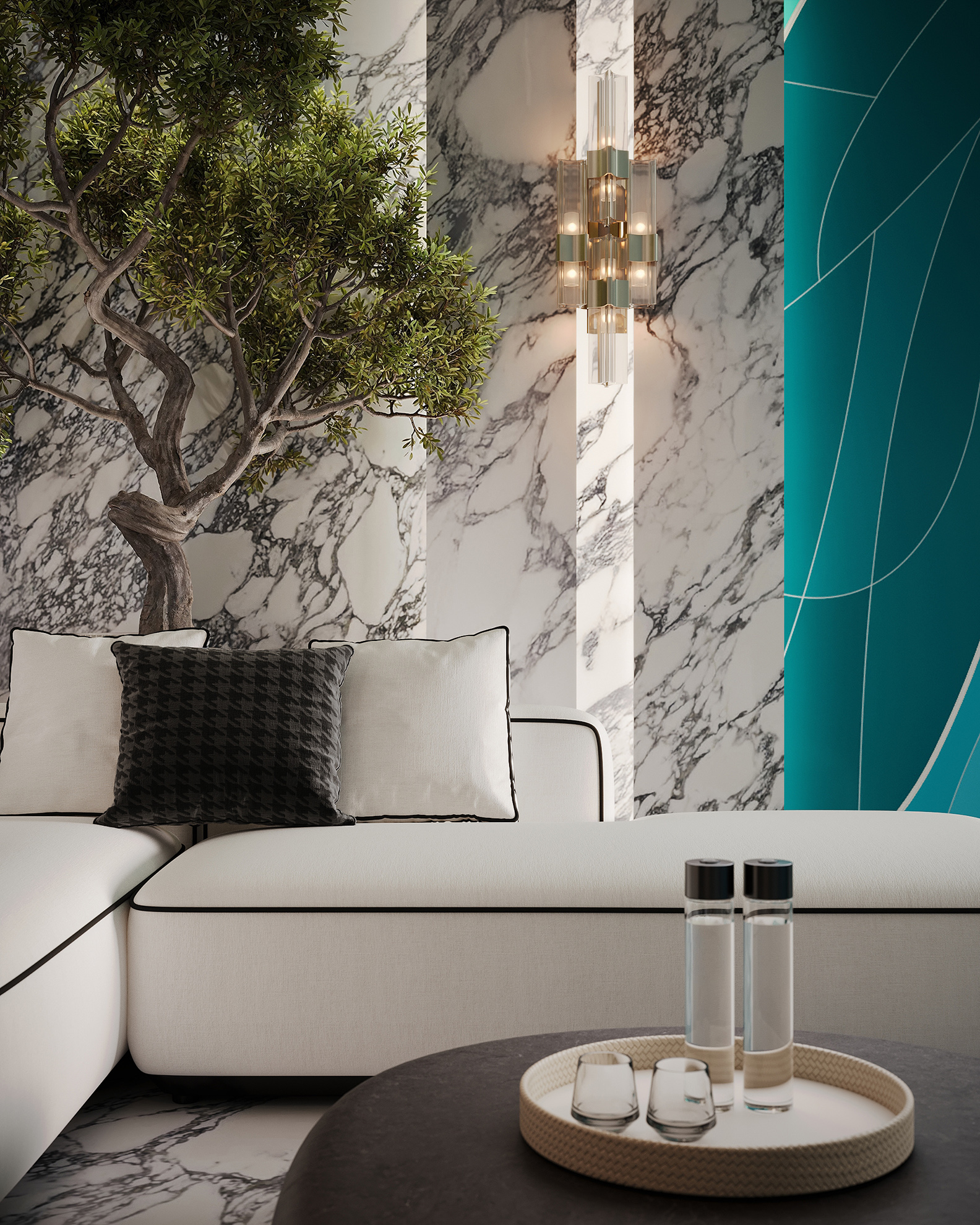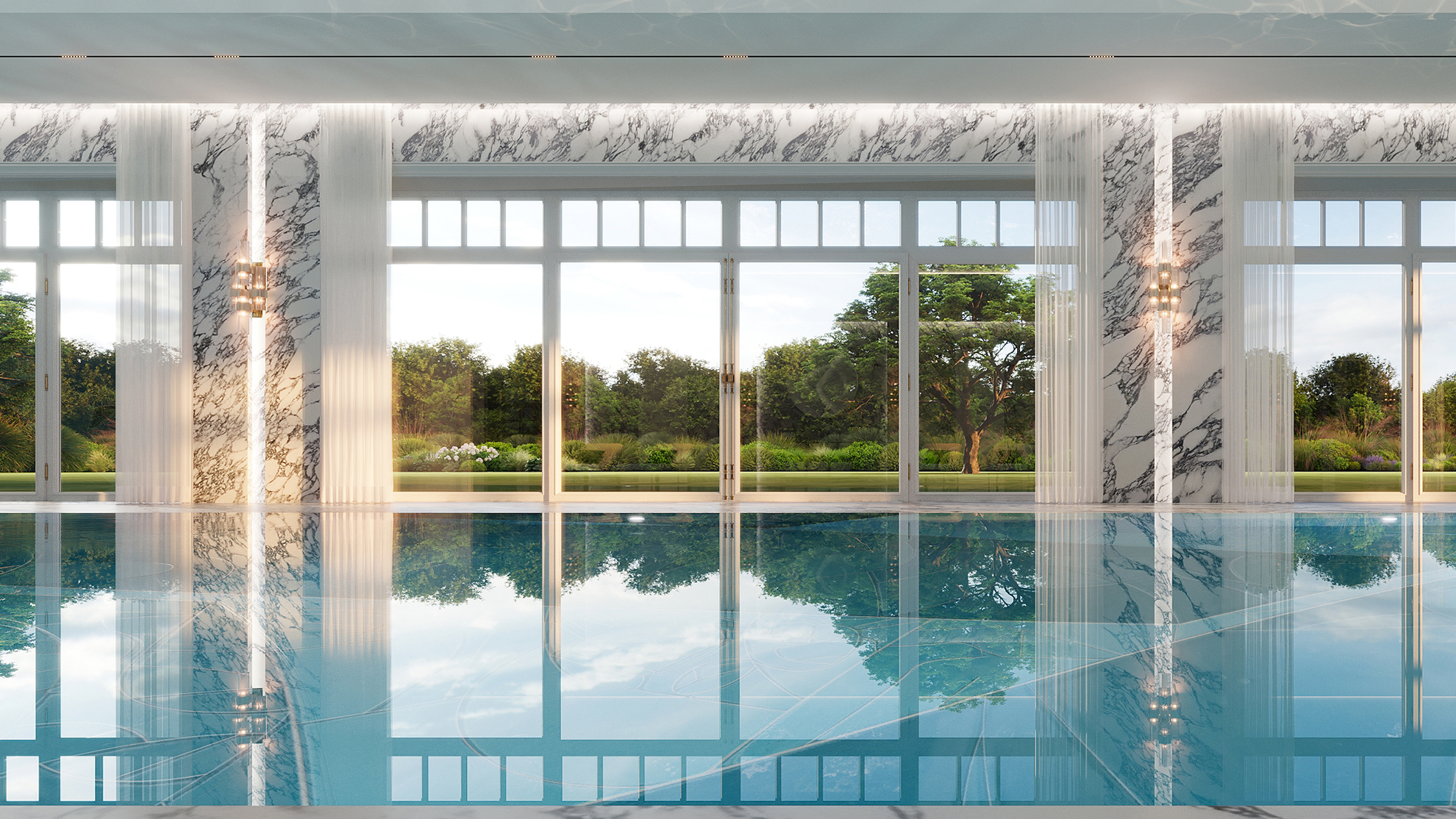 This residence, located in an exclusive and picturesque town, is designed in a contemporary classic style. The main house spans 2,400 m², complemented by a 1,700 m² spa complex and a 430 m² summer house. The interiors combine timeless classical detailing with modern premium materials and furnishings, offering both sophistication and long-term comfort.The corridors and entrance hall are designed in harmony with the overall style, featuring marble finishes. The flooring, with its black, white, and gray geometric motif, sets a graphic accent. An Officina Luce chandelier and De Gournay decorative panels highlight the elegance of the space.The generous living room integrates lounge and reception areas. Traditional ceiling moldings are paired with contemporary Flos lighting and a striking Lalique chandelier. Minotti furnishings add warmth and refinement, while expansive panoramic windows bathe the space in natural light.Walls are finished with bespoke wallpapers by the French atelier Décorné, each piece hand-painted by artisans preserving centuries-old techniques. For this project, shades and textures were custom-selected to achieve the required depth and effect. The palette is anchored in soft neutrals, enhanced with bold blue and burgundy accents. Across the interiors, only natural materials are used, including wood, marble, and onyx.The living area blends seamlessly with the dining room, both unified by the residence’s contemporary classic aesthetic. Decorative detailing, premium finishes, and Lalique chandeliers create a refined atmosphere, where every element complements the next in perfect balance.The custom-made Officine Gullo kitchen balances professional-grade functionality with exceptional aesthetics. The dining space maintains a restrained elegance, accented by statement chairs from Sofa & Chair London. At the center hangs a Baccarat crystal chandelier, adding a note of grandeur.A space where prestige meets refinement, the study offers the perfect environment for work and reflection. Poltrona Frau sofas provide comfort, complemented by a Moooi rug, Oficina Luce lighting, and furnishings by Giorgetti and Opera.Dedicated to wellness and relaxation, the spa combines natural materials, carefully designed lighting, and tactile textures to create a calm, restorative environment. Green accent details and a vertical plant wall reinforce the connection with nature.The spa center also features a 25-meter swimming pool. The pool is finished with Sicis mosaic tiles, creating an exquisite interplay of light, texture, and color in the water. Natural marble flooring surrounds the pool, enhancing the sense of luxury and timeless elegance.This project embodies the Bolshakova Studio philosophy: a comprehensive approach to space, meticulous attention to detail, and the curation of world-leading brands. The result is a residence in a contemporary classic style that guarantees timeless aesthetics, comfort, and enduring quality.